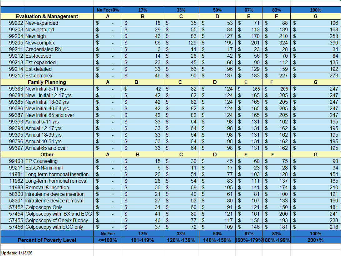 Our family planning fee schedule is updated annually and includes pricing for self pay clients. Laboratory test fees are in addition to the office visit fees posted. Please contact us if you have any questions.